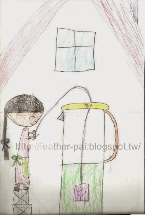 羽羽怕我們不知道她在畫什麼? 還寫「茶」給我們看,多貼心的小孩啊~呵~ |